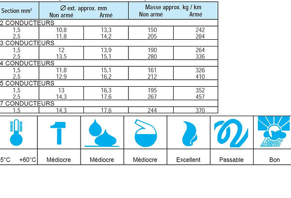 Ces câbles sont sans halogène : en cas d’incendie, les gaz dégagés sont non corrosifs et de toxicité très réduite. Ces câbles seront installés dans des zones ne présentant pas de risques mécaniques. Outre la fonction câble de sécurité incendie, ce câble peut être utilisé en hautes ou basses températures : -50°C à +150°C.